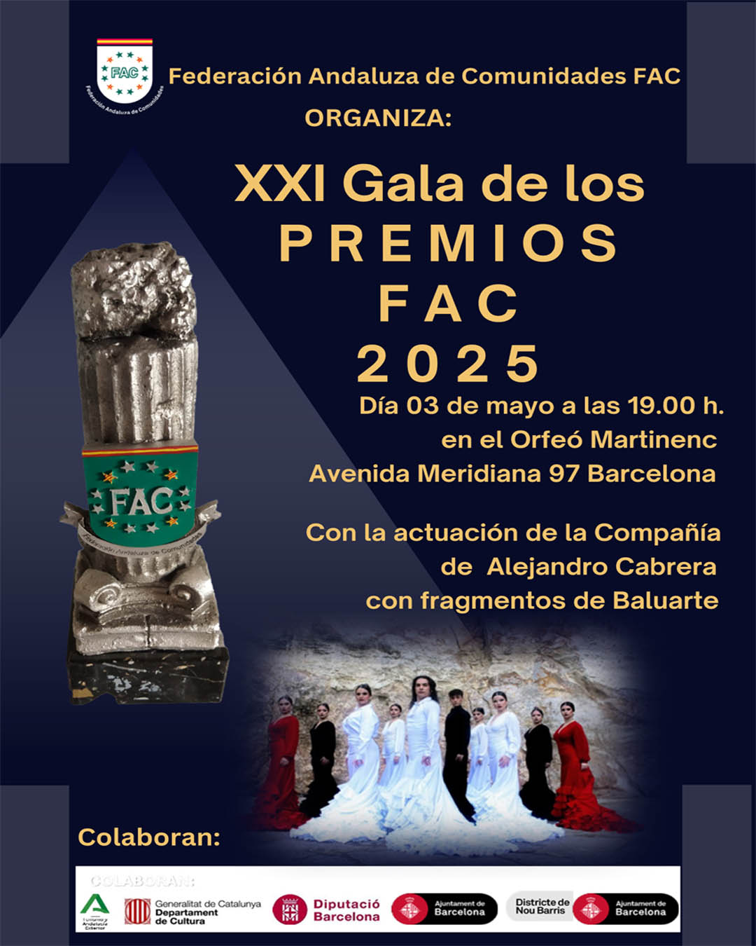 mayo 3, 2025 @ 19:00 - 21:00 XXI Gala de los Premios FAC 2025 Orfeó Martinenc Avinguda Meridiana, 97, Barcelona, Spain